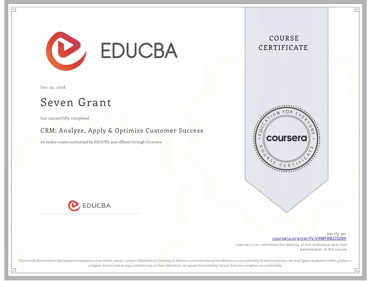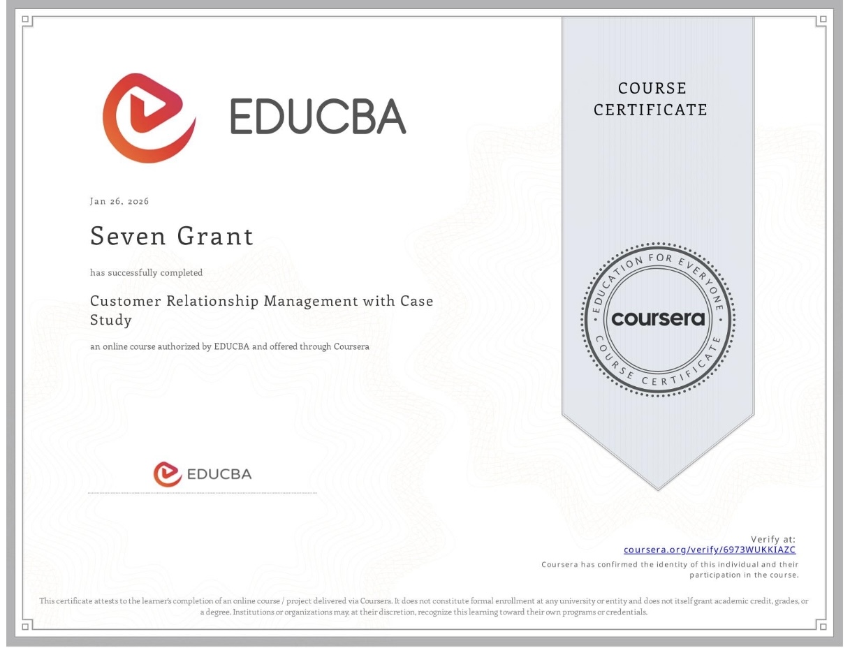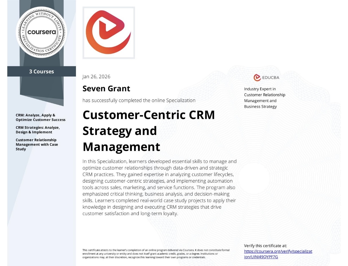 Completed a comprehensive CRM specialization focused on analyzing, designing, and implementing customer-centric strategies. Covered the full customer lifecycle, leveraging CRM frameworks, analytics, and automation to improve acquisition, retention, and long-term customer value. Real-world case studies bridged theory and practice, equipping learners with actionable CRM skills.